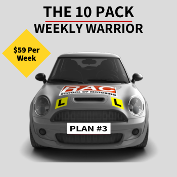 Plan #3 - The 10 Pack - Weekly Warrior is for those who wish to log those hours fast! It includes 10 x 60 minute driving lessons with one of our experienced and friendly instructors. The subscription fee for this package is just $59 per week for 13 weeks, with $50 due on sign up in addition to the week 1 payment. This enables you to start driving lessons right away along with the ability to take one 60 minute driving lesson per week!
